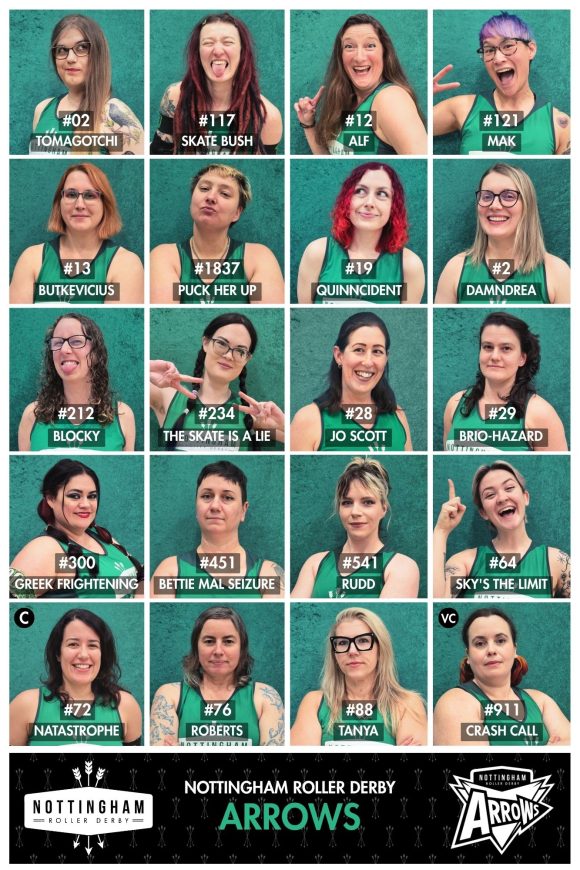 We currently have two competing teams within our league: Nottingham Roller Derby Arrows (A team), Nottingham Roller Derby Bolts (B team) for players identifying as women and gender expansive. We have separate training days to focus on each team individually but scrim together regularly. We also have a mix of people who coach, NSO and referee.