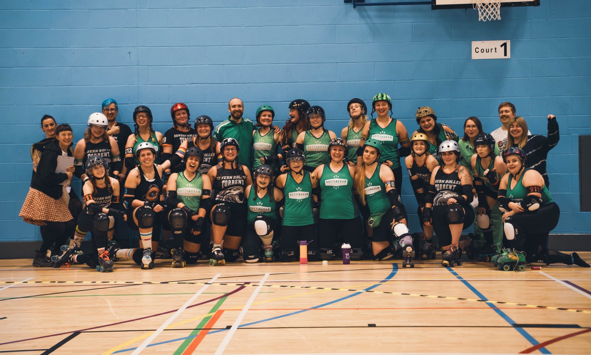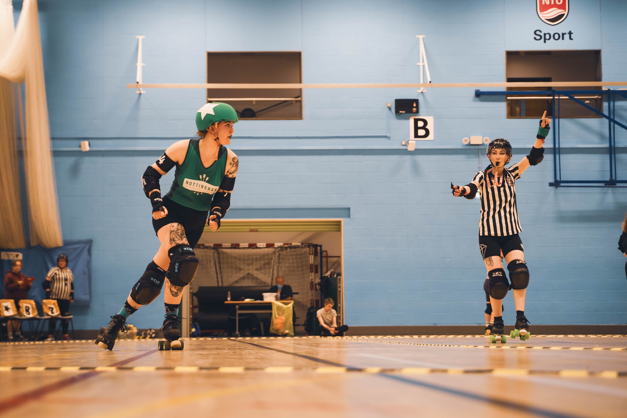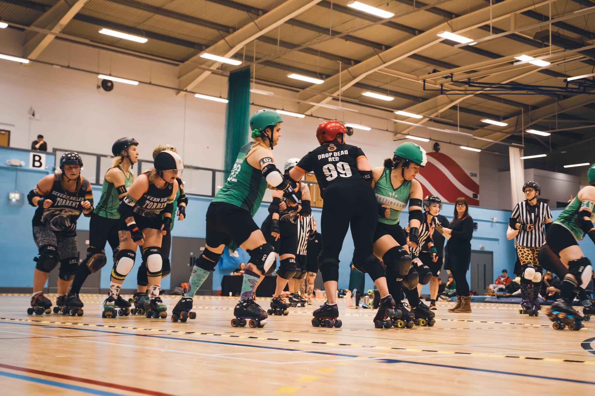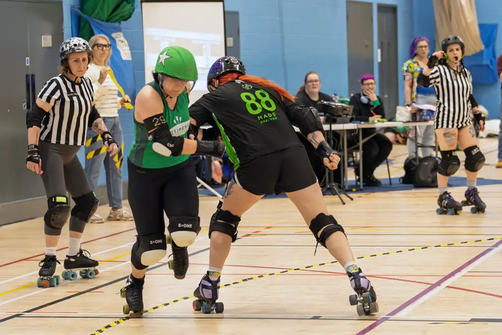 Teams of five skaters play in each two minute ‘jam’ – each team consists of a ‘jammer’ and four ‘blockers’. The jammers are the point scorers and race against each other through the pack and around the track. The blockers do all they can to help their jammer through and stop the other team’s jammer. Each game is made up of two 30 minute halves.